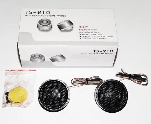 Твітери для автомобільних аудіосистем виготовлені у формі компактних колонок (діаметром буквально 3-5 сантиметрів), які можна зручно розмістити на передній панелі або передніх стійках. Також високочастотні динаміки входять до складу коаксіальних акустичних систем, проте принципово вони нічим не відрізняються від твітерів, що продаються окремо. На сьогодні найбільше поширення здобули «пискалки» електродинамічного типу, тобто звичайні динаміки, але лише малого розміру й особливої конструкції. Твітери TS-210 240 W легко монтуються в салон автомобіля й чудово доповнять Вашу акустичну систему. Надійний захист динаміків забезпечує міцна сталева сітка, охолодження звукової котушки здійснюється магнітною рідиною.