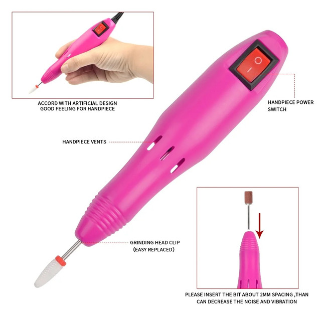 Фрезер для манікюру можна використовувати й для педикюру, але його потужності недостатньо для апаратного педикюру. У наборі з фрезером для манікюру йдуть 6 різних металевих насадок і 6 одноразових ковпачків до них. Максимальна швидкість обертання — 20 000 обертів на хвилину.